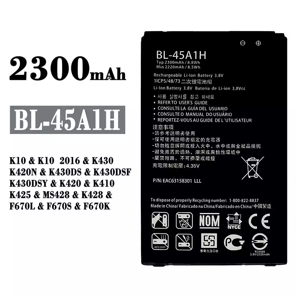 Akun malli BL-45A1H sovittaa LG K10 / K10 2016 / K430 / K420N / K430DS / K430DSF / K430DSY / K420 / K410 / K425 / MS428 / K428 / F670L / F670S / F670K