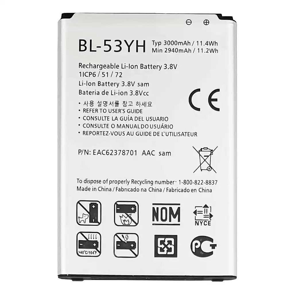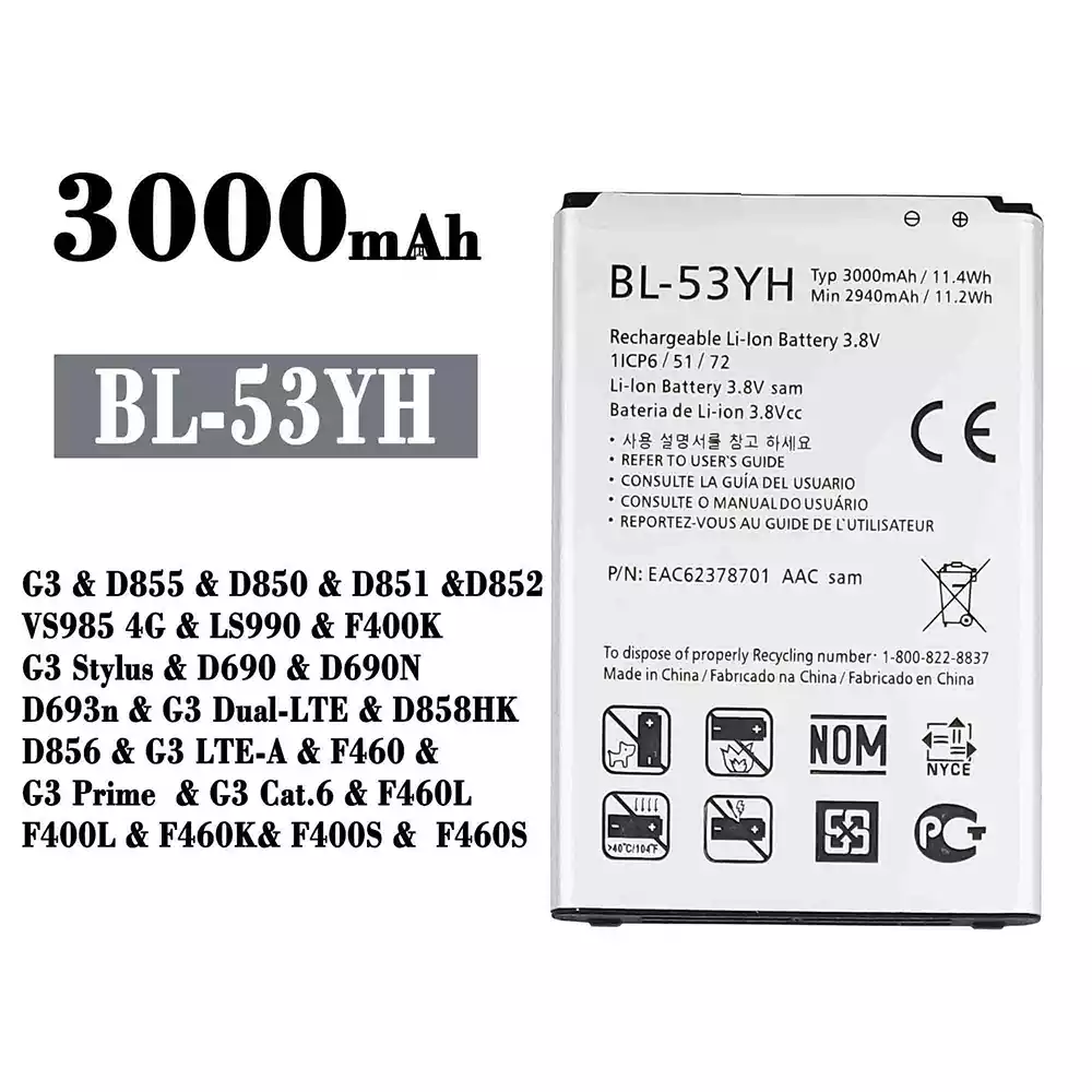 Akun malli BL-53YH sovittaa LG G3 / D855 / D850 / D851 / D852 / VS985 4G / LS990 / F400K / G3 Stylus / D690 / D690N / D693n / G3 Dual-LTE / D858HK / D856 / G3 LTE-A / F460 / G3 Prime / G3 Cat.6 / F460L / F400L / F460K / F400S / F460S