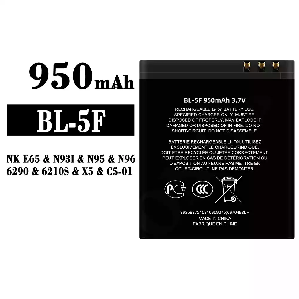 Akun malli BL-5F sovittaa Nokia NK E65 / N93I / N95 / N96 / 6290 / 6210S / X5 / C5-01