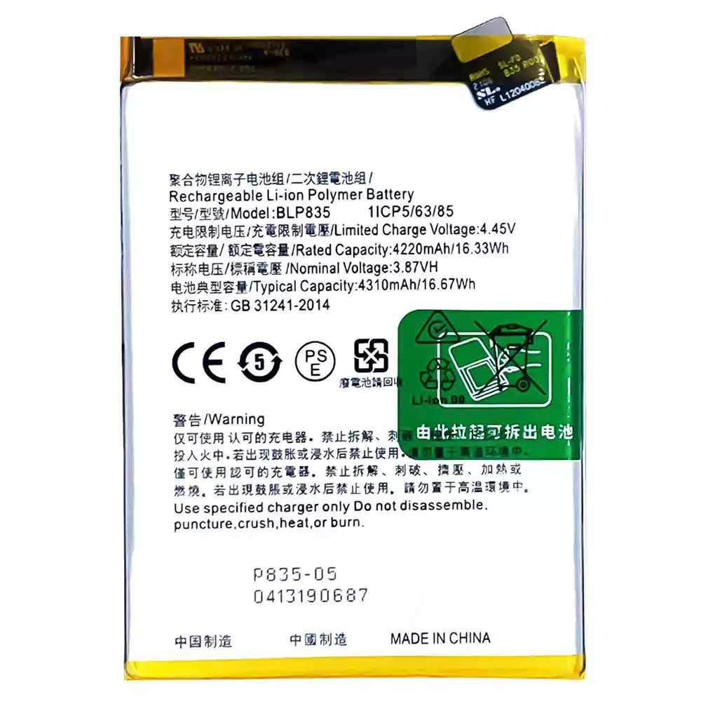 Akun malli BLP835 sovittaa OPPO Reno5 F /Reno5 Lite /F19 Pro /A94 4G /CPH2217 /CPH2205 /CPH2203 /CPH2285