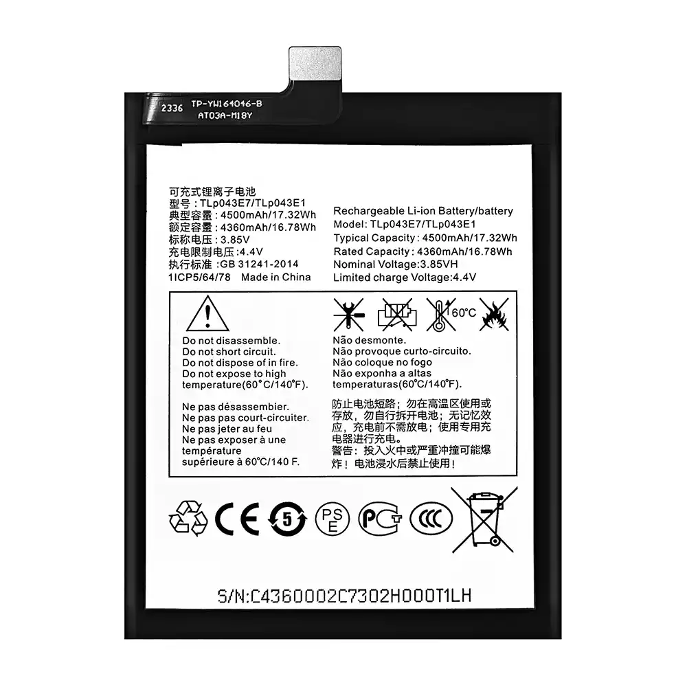 Akun malli TLP043E7/TLP043E1 sovittaa Alcatel T-Mobile RevvI 5G/T790W/TCL 10 5G/T790Y/TCL 20 5G/ T781/TCL 4X 5G/T601DL